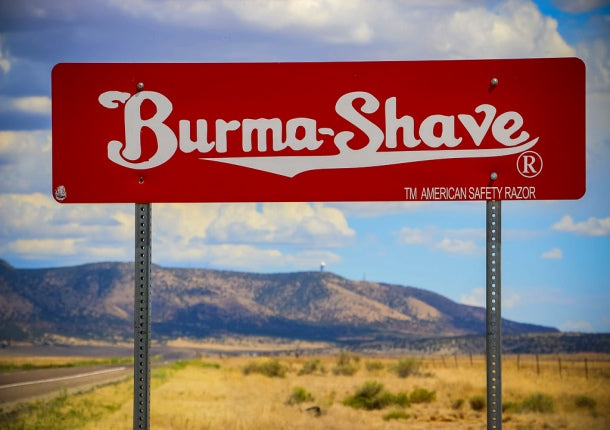 For instance, "If hugging on highways / Is your sport / Trade in your car / For a davenport / Burma-Shave" or "She kissed the hairbrush / By mistake / She thought it was / Her husband Jake / Burma-Shave." The signs became cultural landmarks, as much a part of a road trip as the destinations themselves.