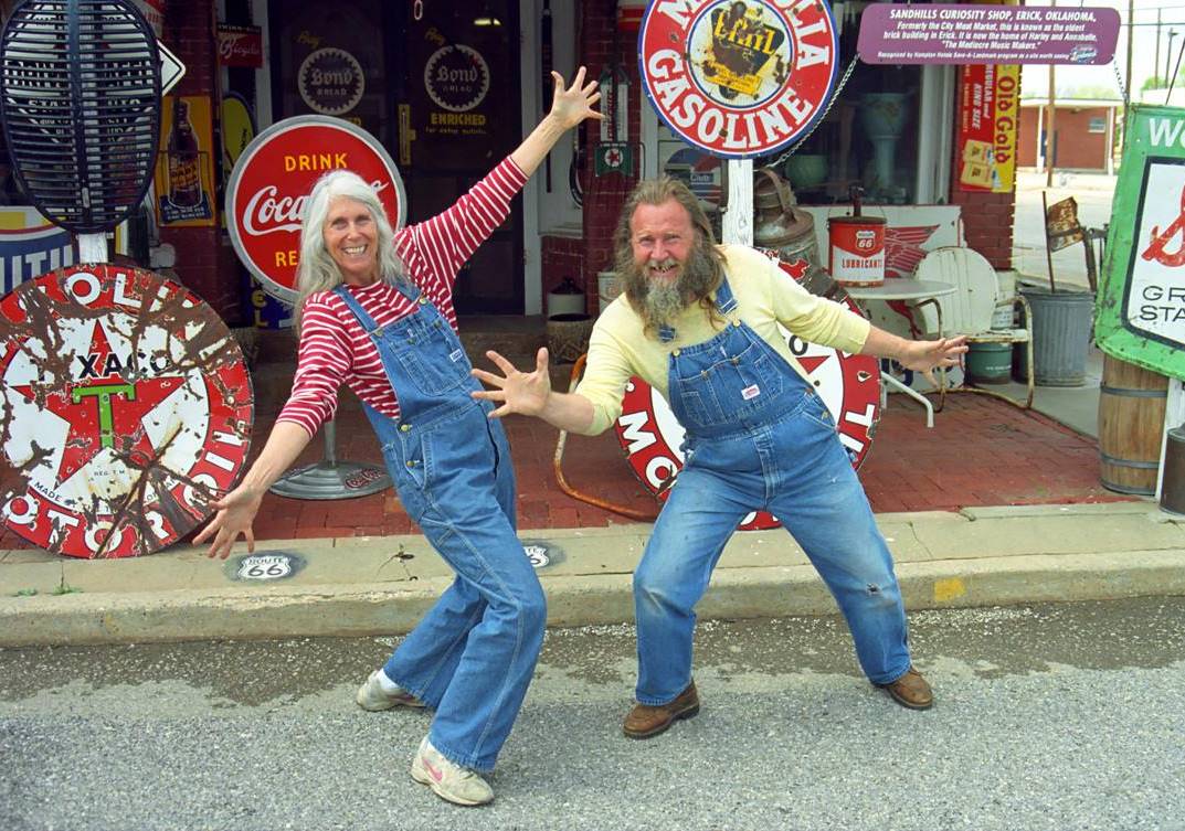 Nestled in the quiet town of Erick, Oklahoma, the Sandhills Curiosity Shop stands as one of the most intriguing and eccentric spots along the historic Route 66. Over the years, it has become a must-visit location for travelers and a testament to the spirited individuals who have contributed to the Mother Road's enduring legacy. At the heart of this unique establishment were its equally unique owners: Harley and Annabelle Russell, also endearingly known as the "Mediocre Music Makers." For years and years the two have welcomed our Route 66 tour groups dressed in red and white striped overalls, waving huge American flags and shouting their incorruptable “Yee Haw!!”.